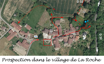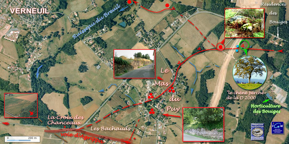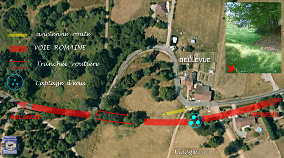 Dans la majeure partie de son cours elle se superpose à un itinéraire romain disparu. Stationnant à hauteur de Bellevue, au bout de quelques pas, un bruit d'eau nous intrigue. Il vient d'une sorte de tumulus moderne qui cache un captage d'eau réalisé anciennement. Nous sommes tenté de considérer cet aménagement comme un indice positif du passage de notre voie antique dont les soubassements résiduels joueraient dans la pente, le rôle d'un aquifère-collecteur (image IGN ci-contre, cercle bleu) |