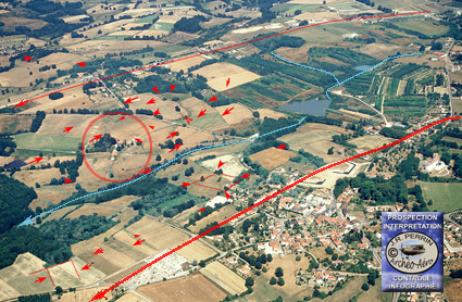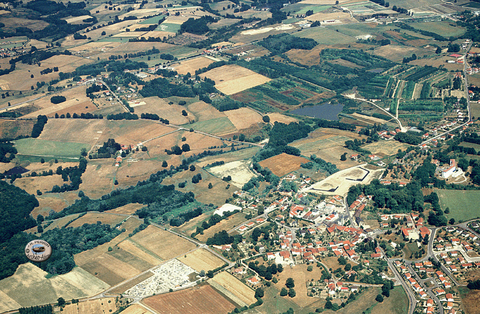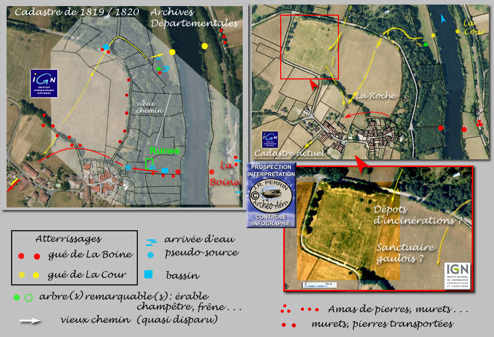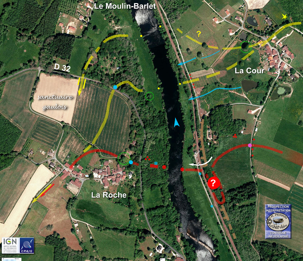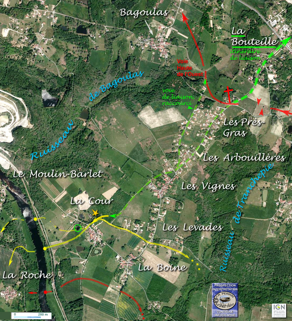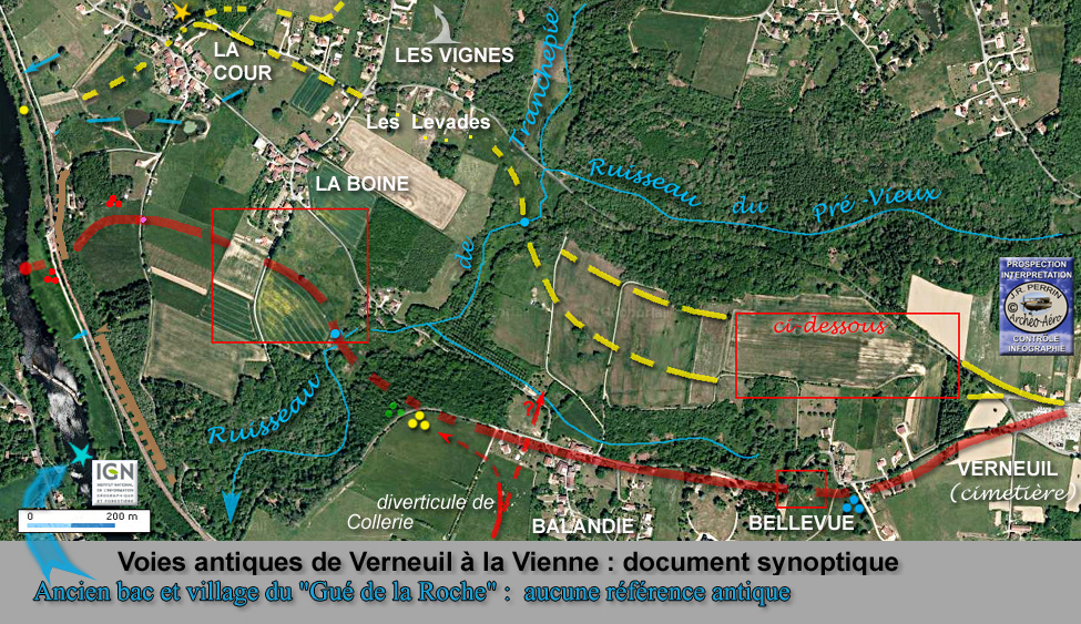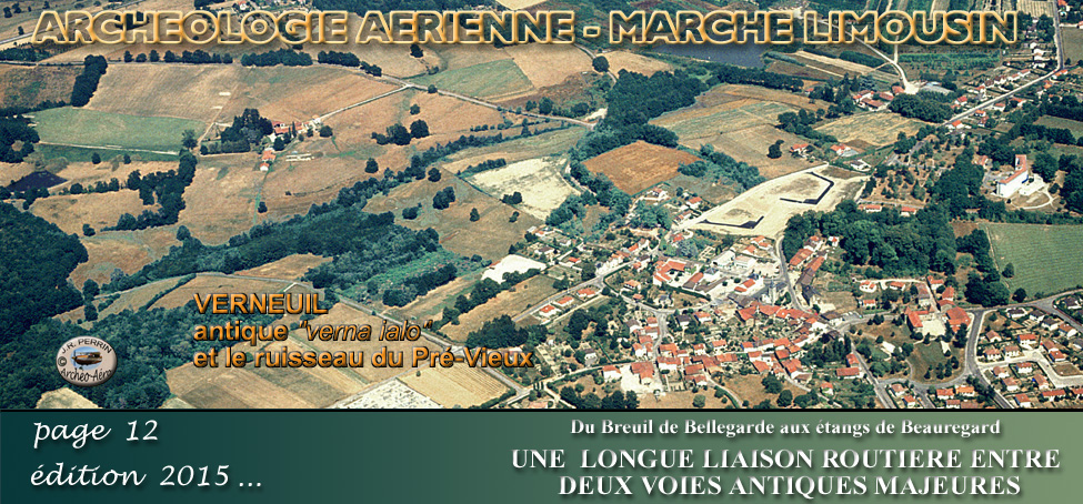 Car la vision globale d'un tel terroir est encore sans exemple en Limousin : des linéaments parallèles signalant de courts fossés comblés, sans prolongements lointains, dans lesquels nous pensons voir la marque de lieux de passage obligés destinés à protéger localement un espace privé proche. D'autres fossés, simples traits, s'avèrent bien difficiles à inventorier en raison du manque de précision de traces dispersées . Deux enclos carrés semblent s'individualiser au plus près de l'agglomération actuelle de Verneuil. Le site montre une particulière densité d'indices sur les flancs de la vallée du Ruisseau du Pré-Vieux. Une zone limitée au nord par la Voie Haute de l'Ouest et au sud par la voie d'échange et de liaison qui nous occupe et qui va nous conduire à un gué antique dominé en rive droite de la Vienne, par le village de la Boine et en rive gauche, par le vieux village perché de la Roche. |