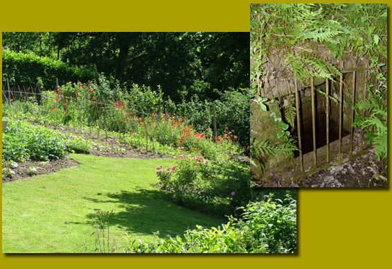 | Panoramique ci-dessus : Sortie du couvert forestier et après la fontaine cachée à droite sous un arbuste d'ornement, le