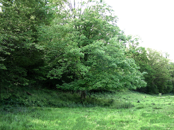 Cette rampe est visible derrière l'érable de premier plan, à droite et au bout des branches. Rappelons que l'érable champêtre est la seule variété qui périclite sur un sol trop sec et fait preuve d'une affinité calcicole modérée : la nature est bien faite, non ? Puis la voie vire à gauche au pied d'une haute levée de terre qui peut s'apprécier en sous-bois. Elle a pu être érigée là, dominant la courte terrasse d'un virage qui "civilisait" ainsi le dernier tronçon frontalement au niveau actuel de la D 32. |