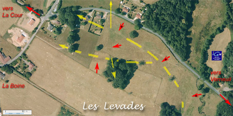 | Un honnête travail de romain pour ce que nous en connaissons ! Après la route actuelle une dépression très amortie dans une vaste culture prolonge la trace et à travers le village actuel, évolue au sud-ouest reprenant ainsi après les gués, l'orientation générale. |