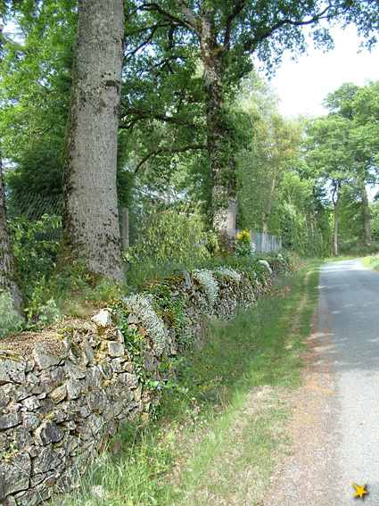 Après Balandie donc la voie antique poursuit un court instant en ligne droite puis bascule dans la pente vers le ruisseau de Tranchepie. A l'intérieur des bois, de fortes cépées de houx marquent cet endroit. En face, dans la haie de l'autre côté de la route, une touffe de genêts avait attiré notre attention - elle était en fleur ! (document IGN ci-dessus, 3 points verts pour le houx, 3 points jaunes pour le genêt). Dix ans plus tard, la haie a été éradiqué, le houx apparaît bien rabougri. La solitude du marcheur de fond