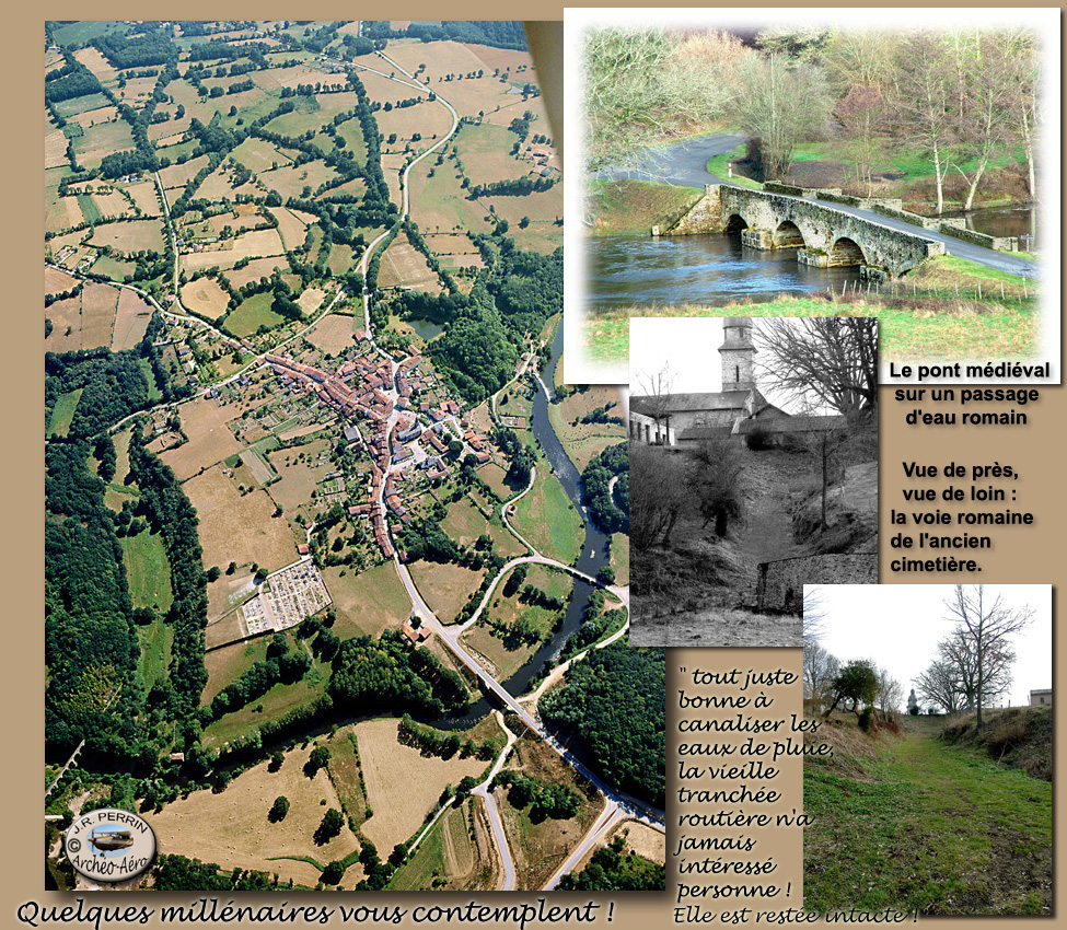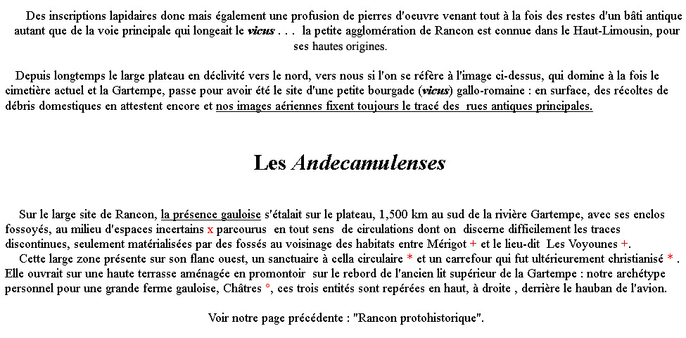 aménagé surplombant la rivière.la route antique Garanti à l'est par un profond ravin, (St Sulpice) l'agglomération antique s'ouvrait à l'ouest sur une légère dépression qui se formait dans la pente et qui entraîna la voie romaine majeure (tracé rouge) vers la rive gauche de la Gartempe qu'elle abordait perpendiculairement au fil de l'eau, selon la meilleure tradition romaine. Dans une prochaine page nous la retrouverons outre-Gartempe, à l'assaut des Côtes-du-Merle puis de la Côte-Loube jusqu'au Clops de Villefavard. De la petite ville antique, il nous reste des traces sur nos photographies : un dessin de rues tirées à l'équerre v sur fond de terres revenues depuis plus d'un millénaire à l'usage agricole, près du cimetière actuel, au milieu du cliché. Mais les habitats antiques pouvaient encore s'étendre à l'ouest , au-delà de la voie. Le morcellement des jardins actuels pourrait être un reste de lotissements plus aristocratiques dont les limites présentent encore une forte tendance à s'orienter en éventail, perpendiculairement à la courbe de la route antique : voir nos photos tant obliques que verticales.