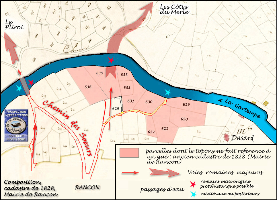 vient facilement éclairer. Il faut se rendre à l'évidence, après la chute de l'Empire romain, l'attirance conservée du gué du vicus desservant les pays du nord-nord-est par le Clops de Villefavard, avait permis, contournant opportunément pendant quelques siècles les ruines de l'ancienne voie romaine, la persistance voire le développement de cet axe de circulation privilégié. Mais on constate par l'ancien cadastre de 1828 l'interruption - très ancienne par sa configuration - de tout trafic causée par l'effacement flagrant à cet endroit, de l'accès à la rivière et l'absence de toute sortie décelable sur l'autre rive. On en déduit que tout le trafic des voyageurs traversant le bourg avait dû un jour, se rabattre sur l'autre voie romaine (celle du sanctuaire païen ou de l'église) qui s'était maintenue depuis sa création antique jusqu'au passage de la Gartempe à l'emplacement du vieux pont actuel. |
