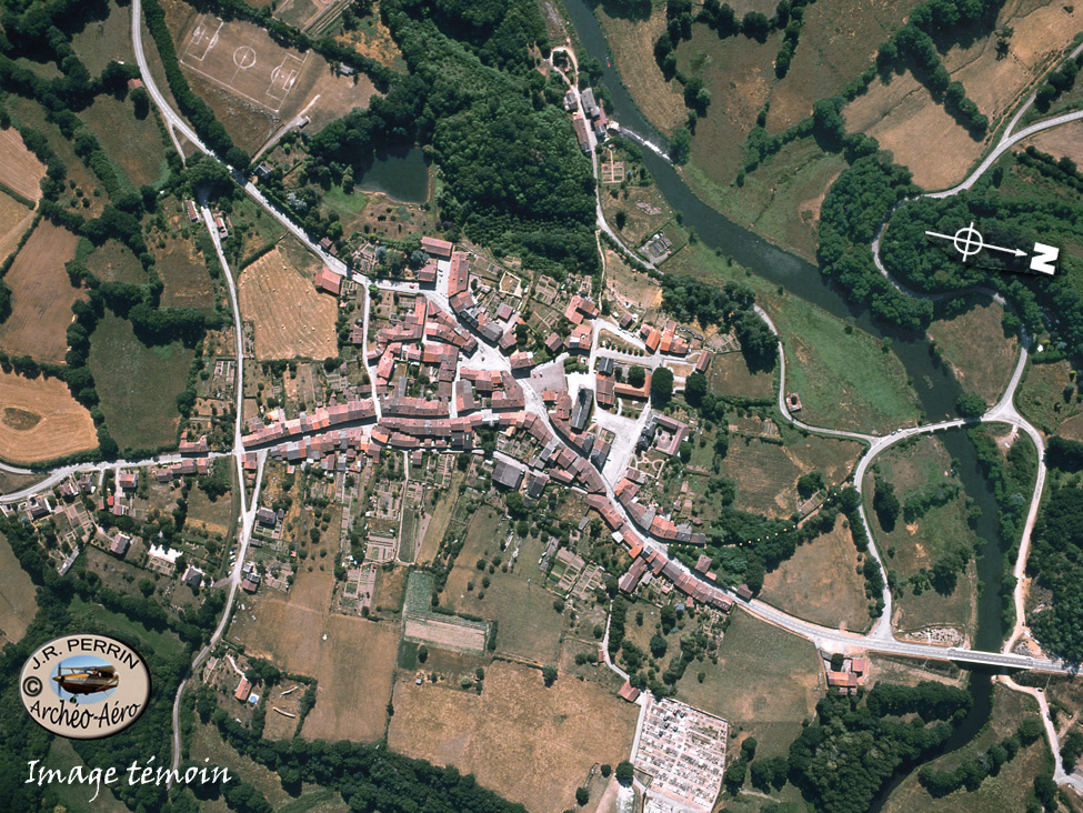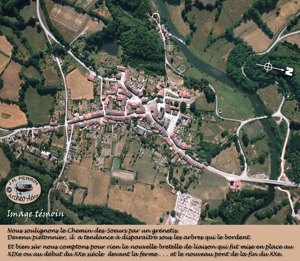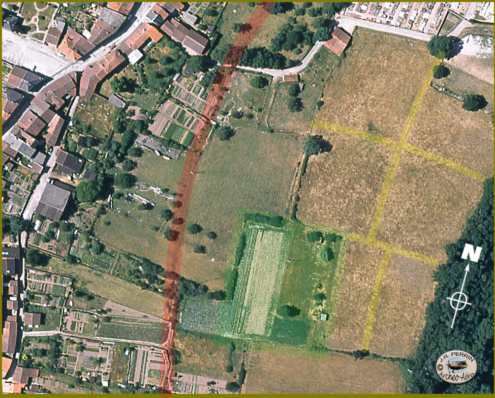 En totalité ou en partie, les rues du vicus antique apparaissent encore dans la grande terre de culture qui s'étend sur la quasi totalité de la moitié droite du cliché. On distingue ainsi une première partie qui fut urbanisée et qui reste grossièrement trapèzoïdale, au contact du cimetière actuel. Disposée en axiale nord-sud la rue cardinale principale (cardo maximus) de ce quartier nord est bien définie depuis le gros arbre en boule du cimetière jusqu'à la proximité de l'angle d'une parcelle complexe au centre bas du cliché. Cet azimut est sensiblement de même valeur que celui de la voie antique à la même hauteur (donc située à distance par le travers exact). Au sud, la seconde partie urbanisée de forme grossièrement carrée, contiguë à la précédente, présente une rue cardinale à l'azimut sensiblement décalé et de la même façon apparemment calqué sur la portion de voie antique située par son travers. Les rues transverses, les rues décumanes, sont moins évidentes à situer.
