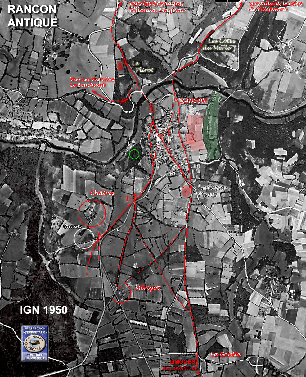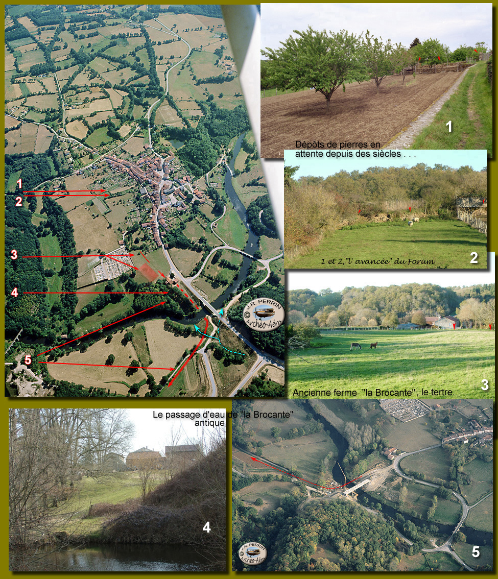 cet endroit pour atteindre progressivement le niveau de la Gartempe. Selon les clichés, la partie principale présente des partitions internes et au hasard des aléas météorologiques, son pourtour est marqué par une large bande vert-foncé que l'on peut interpréter comme une remontée d'humidité au droit d'anciennes et importantes fondations de murs pillés jusque dans leurs fondements profonds. Proche de la zone urbanisée et située en bordure de la voie romaine majeure, on peut sans grand risque indiquer cet espace comme le site du forum antique, espace civil, administratif et religieux de toute agglomération romaine et gallo-romaine. |
