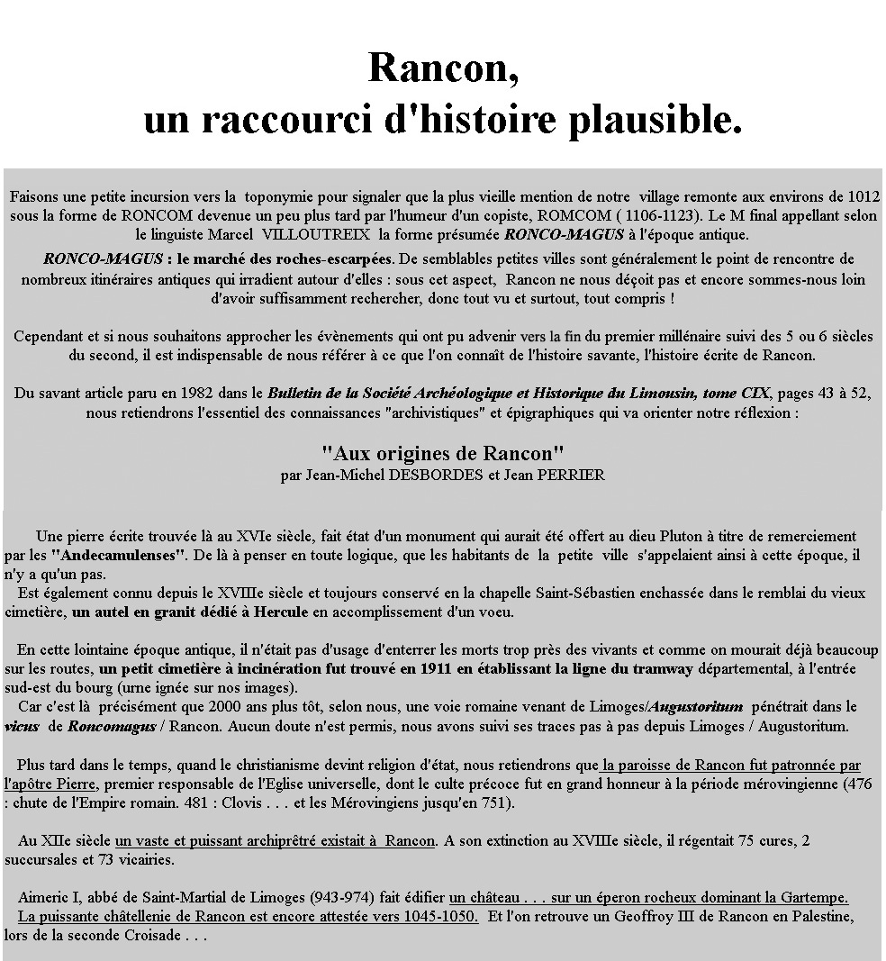 Deux cent cinquante mètres plus bas, revenant vers le bourg actuel, une rue transverse supportait dans la première moitié du XXe siècle, le chemin de fer du tramway départemental. Cette rue marque toujours la limite sud de l'agglomération de Rancon et la gare avait été établie ici précisément et par le plus grand des hasards, sur le passage de la voie romaine. Lors des travaux d'établissement de la ligne il fut découvert à cet endroit précis un cimetière antique à incinérations (urne ignée) : on mourait déjà beaucoup sur les routes il y a 2000 ans. Une autre voie romaine