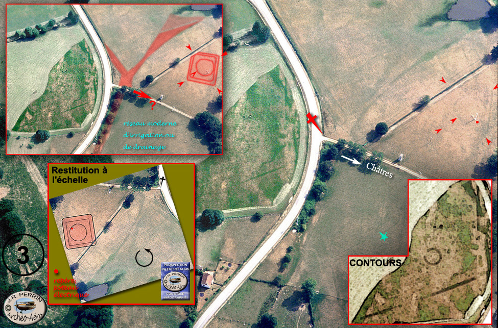 Et au même endroit, peu après la jonction des départementales D1 et D7 donc, un très vieux carrefour est fossilisé à une dizaine de mètres à l'ouest de la route actuelle, dans la parcelle d'angle entre la D1 et le chemin de desserte de la ferme de Châtres. Les images (ci-dessus, ci-contre et ci-dessous) nous le restituent à grand-peine. Une voie de circulation semble filer vers l'ouest vers Ardent, Chasseneuil ("cassano-ialo": la clairière des chênes), lieux de peuplement gallo-romains attestés. Présente à l'ancien cadastre, son origine antique est très probable : contournement d'un monument rituel détecté sur nos photos (voir plus loin). D'autres voies, simples indices à peine discernables, s'échappent de ce carrefour vers le sud, parfois mentionnées au cadastre de 1828, parfois totalement disparues : nos différents clichés appuyés par celui de Google earth nous permettent de les restituer de façon ponctuelle mais sans continuité discernable. Parmi elles et très localement, maigre consolation, une emprise de grande largeur trahit peut-être une voie romaine totalement pillée et nivelée ! (ci-dessus, flèches rouges affrontées, photo 1) ou une voie de proximité d'origine gauloise ( cf La Chatrusse). |