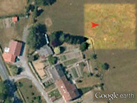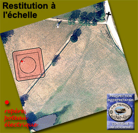 Puis un cercle d'une grande régularité sur un agrandissement de GOOGLE, que l'on assimilera faute de mieux, à la trace d'une immense cabane (ci-contre) et dans la même parcelle, sur nos images, jouxtant les jardins de Mérigot, à peine discernable, quelque chose comme des petites parcelles de culture, un hortillonnage. Non loin, de l'autre côté du vieux chemin, l'image suggère un possible réseau d'irrigation rayonnant autour d'un puits ou d'une source centrale avec, sur la branche ouest tout au moins, des épillets déférents (photos Quintane ci-dessous, point bleu). |