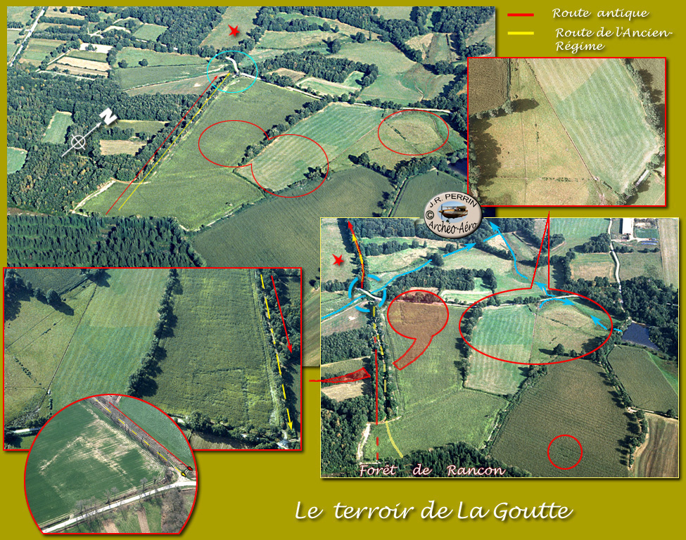 Les traces périphériques, où la culture se montre en dépression sensible, sont dues à un retard de croissance du végétal cultivé; ce sont des traces d'aridité dont l'origine n'est pas évidente. Au centre de la grande parcelle d'autres traces, peu marquées , à recoupement orthogonal semble-t-il, sont à considérer avec circonspection et en tout cas à surveiller sur les documents aériens de l'internet. Ce qui n'exclurait pas, périodiquement et à des moments propices, le contrôle rapide par observation aérienne sur la zone. Une parcelle contiguë présente en phase sensible avec des aléas météorologiques , une ligne de discontinuité d'apparence manifestement due à une intervention humaine d'ordre physico-chimique, très difficile à situer dans le temps : nous avons observé de semblables anomalies au dessin plus typé encore, dans le proche environnement de la ferme gallo-romaine de Buxerolles près de Bussière-Poitevine (site " limousin-archeo-aero"). Plus près de nous, sur la partie la plus claire, des traces circulaires peuvent être le souvenir d'anciennes cabanes d'habitat. La Goutte : "la terre humide qui s'égoutte ?" De fait, une troisième parcelle porte des traces de chenaux de drainage au dessin particulièrement soigné, avec collecteur transversal évacuant à ses deux extrémités les effluents vers le ruisseau proche. Il en résulte une zone d'assèchement particulièrement nette. L'ensemble de l'aménagement dénote une maîtrise qui nous fait penser au projet d'un villicus éclairé (chef de culture gallo-romain, photos et vignettes ci-dessus). |