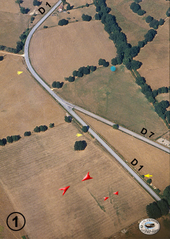 Et c'est sans doute là que se situe l'origine de ces croix de dévotion dont les cartes de l'IGN et les vieux cadastres du XIXe sont les seuls à nous rappeler le souvenir, attestant ainsi la grande antiquité de la fréquentation de ces lieux. Tel le carrefour ancien - voire antique - de Châtres ainsi que le suivant sur la D 1, avec pour ce dernier également, nous l'avons dit, la trace sensible (signalée dans un rond vert), d'une structure rectangulaire . |