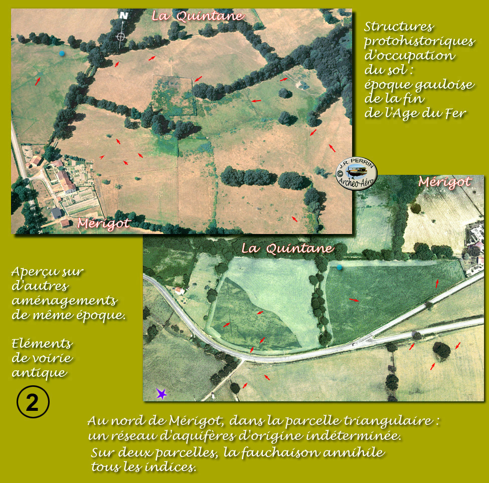 Des tracés doubles de couleur rouge, au sud de Mérigot, des marques de courtes voies, des petits cheminements et des emprises qui ont une forte connotation protohistorique (les enclos, les fonds de cabane, les courtes pistes matérialisées à double fossé . . .). Des traits rouges plus appuyés et d'une seule venue restituent selon nous, des itinéraires dont les caractéristiques seraient proches de la tradition romaine. Les couleurs jaune enfin ou orangé marqueraient une expectative. Dans la contexte ambiant : Châtres, Mérigot, la Quintane . . . , il est tout à fait possible que nous percevions là d'anciens itinéraires gaulois, rarement perceptibles en tant que tels, mais ici "romanisés". |
