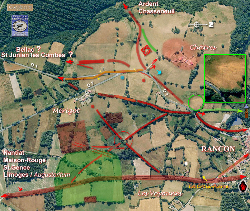 Dans le cas qui nous occupe la présence irrécusable de deux ces deux échangeurs en croix validerait l'origine antique en tout ou partie, de la voie de Mérigot à Rancon, ce qui ne tomberait pas sous le sens en l'absence de cet artifice (desserte tardive du "Château de Rancon"). NB : Ces échangeurs en croix entre deux itinéraires majeurs, permettaient aux voyageurs, d'où qu'ils viennent et où qu'ils souhaitent aller, de transiter aussi bien par le centre commercial, rituel ou administratif du vicus ou au contraire de contourner l'agglomération, sans allonger pour autant leur parcours. |