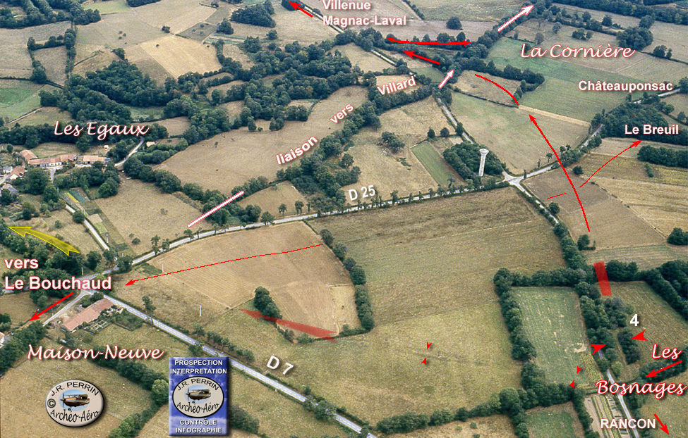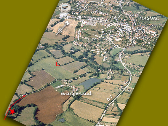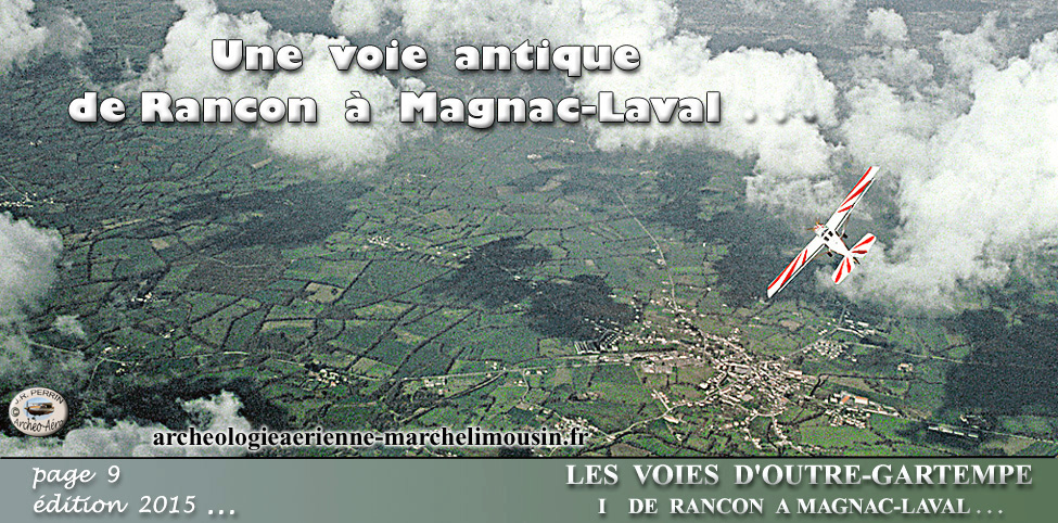 L'histoire des voies antiques ? Des idées simples qui font leur chemin !N'existerait-il pas un autre gué sur la rivière en amont ou même un petit pont ? C'est bien le cas nous a-t-on dit. Sur les documents de l'internet relayés par nos photos verticales prises il y a un peu plus de 20 ans, des directions apparaissent dans le tissu urbain, guidées par des rues, des limites de propriétés, l'orientation de petits détails. Même après deux mille ans d'histoire, rien ne disparaît tout à fait complétement : nous pensons l'avoir montré. Depuis Rancon, nous avons fait globalement route au nord avec cependant un soupçon d'ouest dans notre cap : disons globalement, du 350. Au delà de Magnac il n'y a aucune raison pour que notre ingénieur romain ait changé d'avis ! Alors, si le coeur vous en dit . . . vous en savez assez pour mener à bien la suite de la prospection ! |