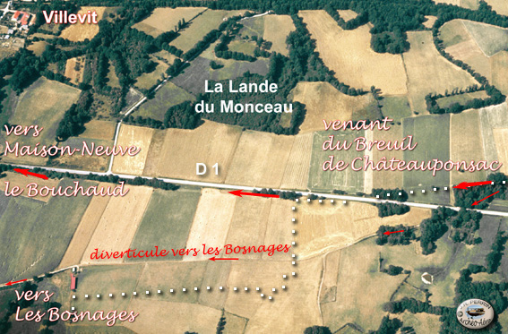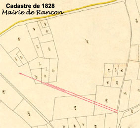 présent dans le paysage mais souvent envahi par l'eau (voir la photo ci-dessous). Ces petites voies, artifices routiers, ne laissent souvent que des indices fugaces, fractionnés . . . que le prospecteur doit recomposer en harmonie avec les voies majeures, pour percevoir leur nature ancienne : ces conjonctions ne sont pas toujours évidentes. Et cela transparaît dans la recherche des prolongements de la voie romaine venant de Châteauponsac, après le château d'eau : ici la D 25 prolonge à altitude constante, la D 1 d'antique origine. Supposée d'origine antique, une bretelle de raccordement devait permettre (notre cliché ci-dessous et le vieux cadastre ci-contre) de relier les sites des Bosnages et de Maison-Neuve sans aller passer par le château d'eau ou la Cornière actuels : observez cependant que |