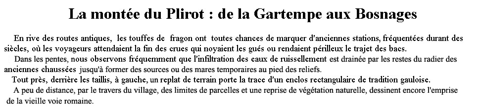 Dans sa dernière partie (depuis la cote 281) le diverticule des Bosnages, ne présente ni l'ampleur ni le tracé direct mais prudent, des itinéraires romains tracés aux lendemains de la conquête, il est en particulier coupé par l'effluent de nombreuses têtes de sources qui génèrent des fondrières. Il pourrait être très tardif. Il est néanmoins cantonné sur toute cette longueur, de murets de pierre sèche que l'on peut interpréter sans grand risque comme la mise au rebut des empierrements, refoulés là à l'époque tardive où les lourdes chaussées romaines ruinées et devenues impraticables entravaient les déplacements. |