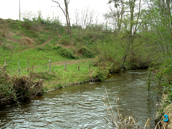 Car, sur une quinzaine de mètres , dénuée de toute végétation arborée, la berge plongeait dans l'eau en pente douce. Quatre rangs de fil barbelé semblaient avoir été mis là pour interdire au bétail l'approche de l'eau et la traversée de la rivière (photo 3 ci-contre). La descente avait manifestement été créée naturellement par les bovins attirés par l'eau : les vaches savaient ! |