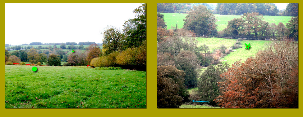 La première photo ci-dessous montrera au fond, à gauche, une lisière rousse de fougères dominant le flanc d'une tranchée qui allait s'approfondissant en descendant vers la Semme (petite flèche bleue, au loin) : c'est bien la trace routière, même si le point de vue photographique éloigné est impuissant à restituer l'impression de visu très positive (repérage flèches rouges pour la saignée). La seconde photo est un effet de "zoom" sur la trace lointaine de la voie (étoile verte). Ce plan rapproché permet d'apprécier l'occupation d'une mini-tranchée par une population d'orties, de ronces et de fougères que nous avons vu subir plusieurs fois et sans grand succès, des tentatives d'éradication. ![]() La Semme, la Montade, les Ages . . . Et, par delà la route, cette saignée est en connexion avec une trace faible mais non équivoque qui traverse les terres de La Montade ( cliché ci-dessous) |