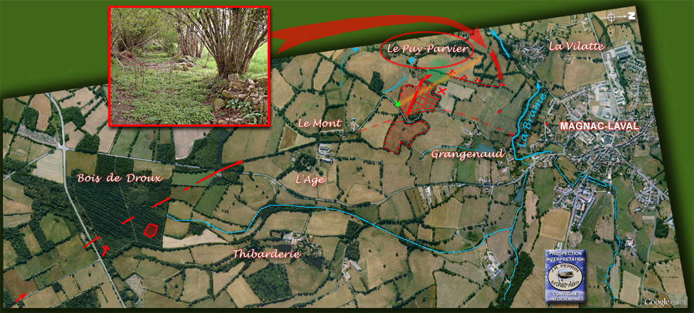 d'autres et d'autres enclos proto. Bonne chance ! Une longue trace d'origine géologique possible barre le site du Puy Parlier. Aucun indice n'est visible sur le terrain sauf une très forte cépée de houx au point précis où elle apparaît au bord de la route communale qui file vers Magnac. Trace géologique possible certes mais son manque de continuité au-delà de 5 à 600 mètres et l'absence totale de modelé au sol, rappellent étrangement les grandes circulations matérialisées sur nos clichés et qui semblent bien encadrer le transit des voyageurs dans la proximité de sites d'habitat gaulois de quelque importance. |