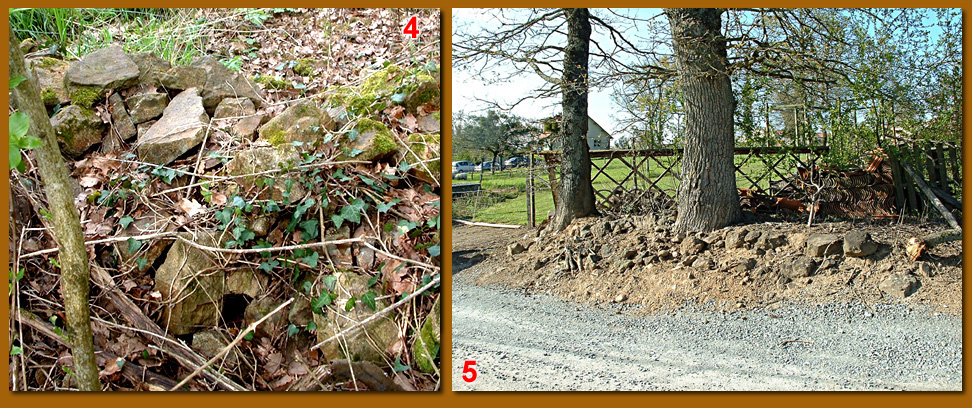 Au hauteur d'un coude sur le tracé, les engins avaient mis au jour au flanc nord de la nouvelle rue et sur une dizaine de mètres, une ancienne chaussée soigneusement empierrée (photo 5). Au même niveau, notre descente perpendiculaire vers la rivière à la recherche d'autres indices d'empierrement, aboutit à une haie qui avait été le réceptacle de pierres de toutes grosseurs (photo 4). Arrivant enfin sur la rive droite de la Brame, nous découvrions une étroite piste à vaches qui prenait le haut talus de la rive gauche en écharpe pour aboutir sur une petite bande de rive. |