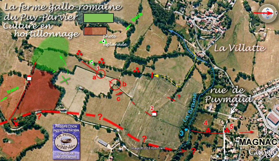 appeler la Villa gallo-romaine du Puy-Parvier : notre cliché au sol de l'extrémité ouest du terre-plein en témoigne.
