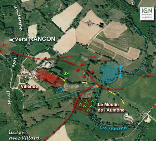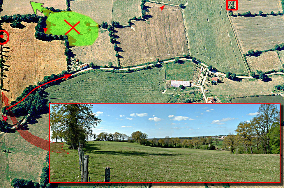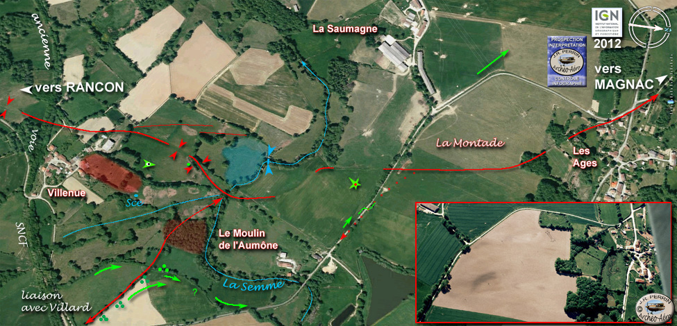 On pouvait ainsi restituer le large contournement de la station agricole et / ou pastorale protohistorique ou antique de Villenue (à-plat rouge ci-dessus et ci-dessous) seulement définie par sa vaste esplanade bordée à l'ouest par une haie dense de buis en limite d'un chemin agricole qui descend vers la Semme. Notre