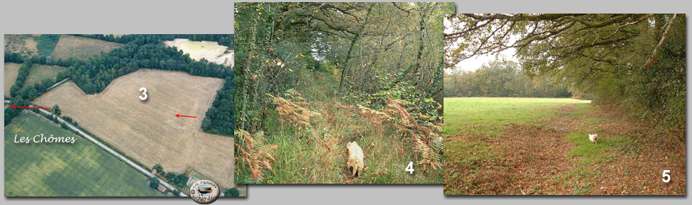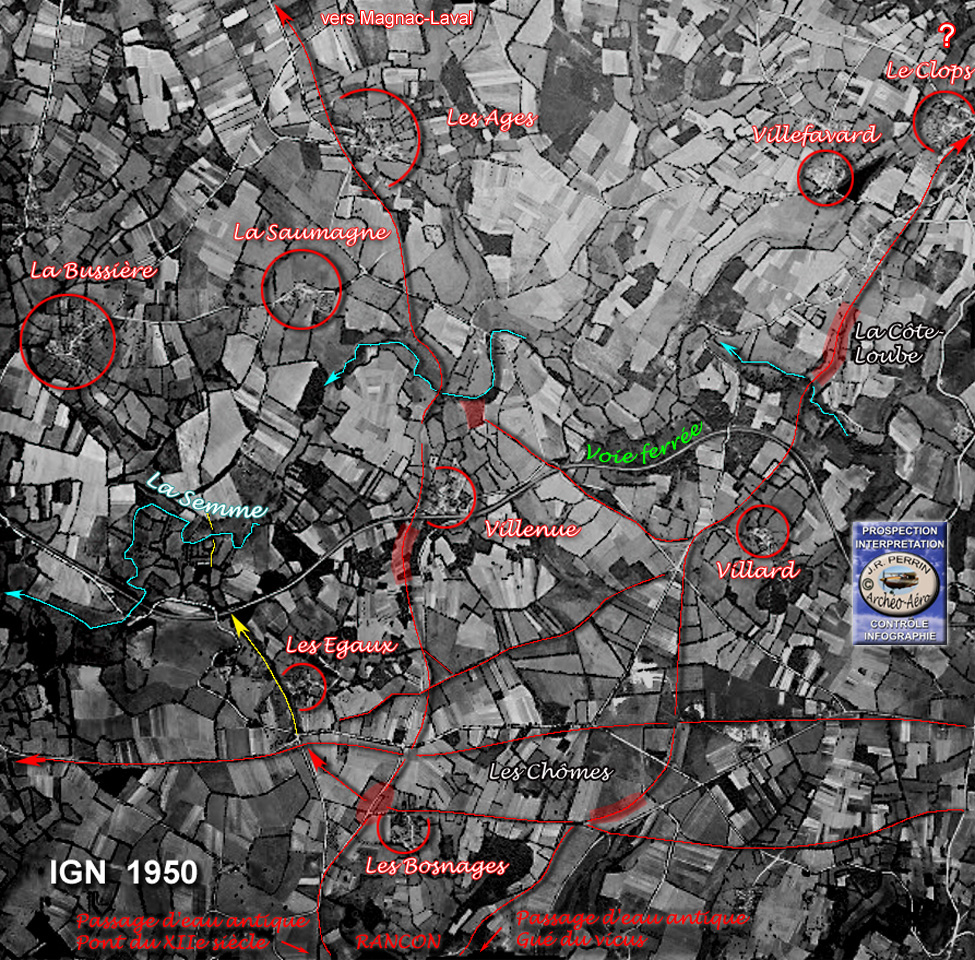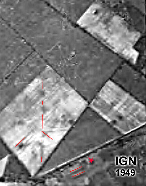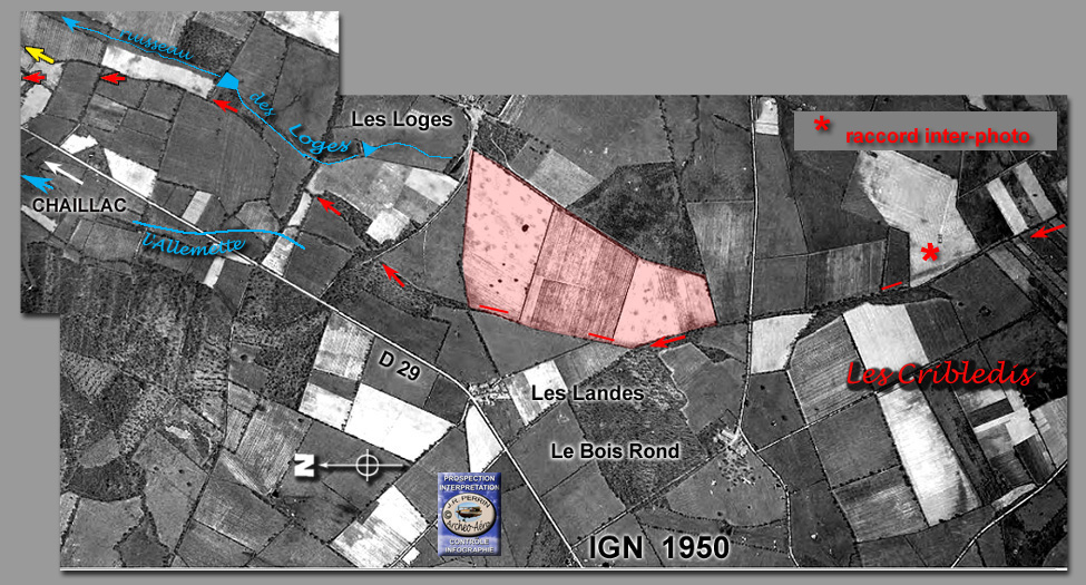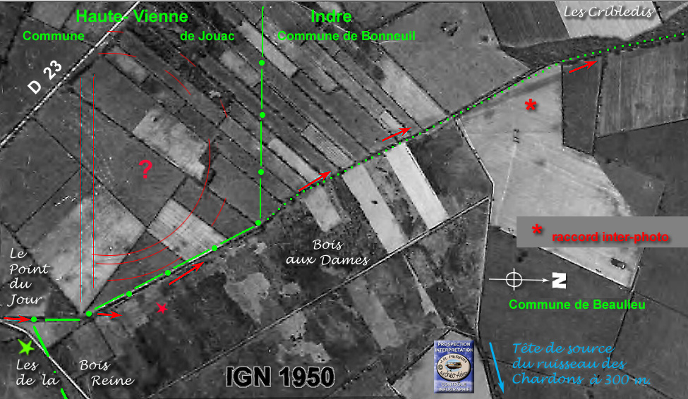 On notera également sur les photos le regain d'intérêt qu'apportent quelques témoignages d'une activité humaine dans le large environnement de la route antique (photos ci-dessous). C'est d'abord et sur des photos en noir-et-blanc, une suite de traces qui prolongent la révélation des chaussées rouges d'Elie de Beaufort jusqu'aux portes de Chaillac. Mais également des labours constellés de macules sombres et un nom générique "les Cribledis" qui s'y rapportent à l'évidence. Bois de la Reine, Bois aux Dames, Bois rond . . . des toponymes boisés. La Minière, la Petite Forge, Chez Pierre de Forges . . . peuvent témoigner de l'intérêt qui fut porté ici à une métallurgie artisanale du fer et sans aucun doute poursuivie bien longtemps après les gaulois. Voire même les Rochères, la Terrière, les Sablons . . . qui pourraient être reliés à des travaux de recherche du minerai. |
