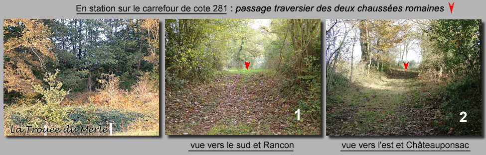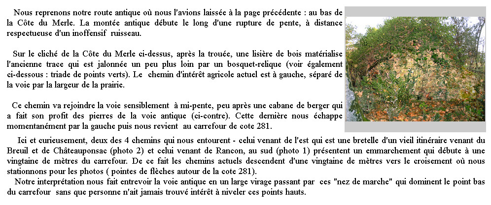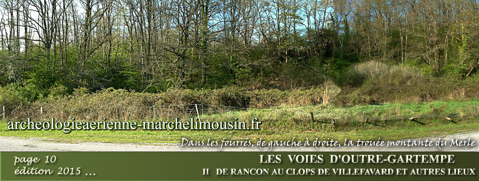La cote d'altitude 300 marque toujours le passage vers le nord, depuis au moins 2000 ans . C'est ici la fin de notre contribution au repérage contrôlé de cette longue trace routière jusque-là inconnue, qui nous est venue par monts et par vaux de Limoges/Augustoritum par les hauts-lieux, protohistoriques et antiques, de St Gence et de Rancon. |