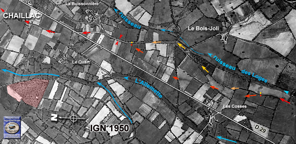C'est alors qu'en suivant de place en place les restes espacés de scories ferrugineuses s'étirant au travers des labours comme une longue série d'indices objectivement incontournables dont nous venons après lui, de retrouver la trace sur des photos aériennes, il trouva une aide puissante et sûre pour poursuivre son trajet antique jusqu'à Chaillac. Ce faisant Elie de BEAUFORT entrait dans une dialectique encore et trop souvent méconnue des rares chercheurs, qui était celle de l'ingénieur romain : aller chercher l'entrée d'un terroir entre deux têtes de source de telle façon que désormais - marchant à distance entre le cours de deux eaux - il pourrait atteindre sa prochaine étape, ici il s'agissait de Chaillac, sans rencontrer aucun ruisseau. Et au pire n'avoir qu'un gué à passer, sur le ruisseau principal, pour continuer sa route. Monsieur de BEAUFORT manqua de repère en cours de route et fut obligé de se mouiller les pieds quelque part entre Les Loges et Bois-Joli. Mais il atteignit bellement la Buissonnière par un large chemin miraculeusement conservé. Des limites de parcelles lui suggèrèrent de laisser Chaillac à sa droite. Nous y sommes après lui et nous n'irons pas plus loin ! Nous avons déjà beaucoup empiété sur les terres des Gaulois Bituriges ! |