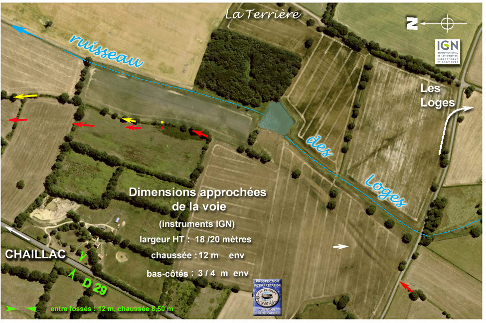 Toutes les photos lisibles que nous avons pu recueillir nous montrent une petite voie sans bas-côtés appréciables et de moins d'une vingtaine de mètres d'assise hors-tout . . . (fossés compris). Mais, nous l'avons déjà dit, on ne sait pas toujours ce que montrent exactement les images : lignes de margines ou traces de fossés. En conséquence cependant, l'itinéraire antique proposé par Travaux d'Archéologie Limousine (2002) autour de St Léger-Magnazeix, heureusement amendé et rectifié par les travaux de 2009, prend soudain une allure de véracité qu'on ne lui avait pas encore connue depuis St Gence. Ce court tronçon de voie constitue un exemple remarquable des résultats que l'on obtient quand la prospection redescend sur terre (!) pour prendre en compte hors de toutes supputations effrénées, une ligne de constats matériels concordants.