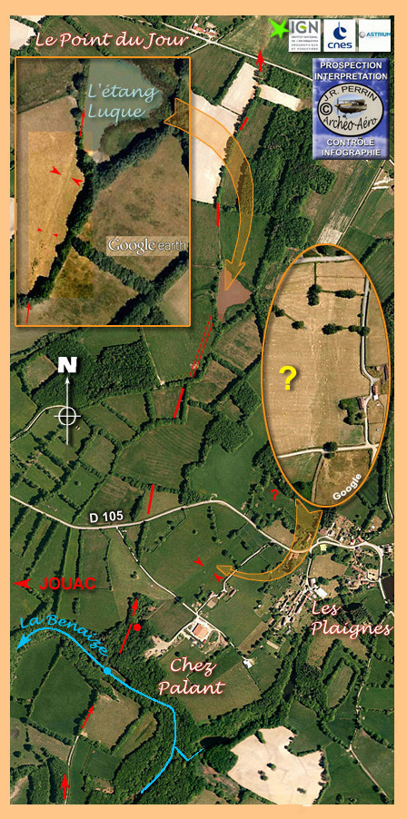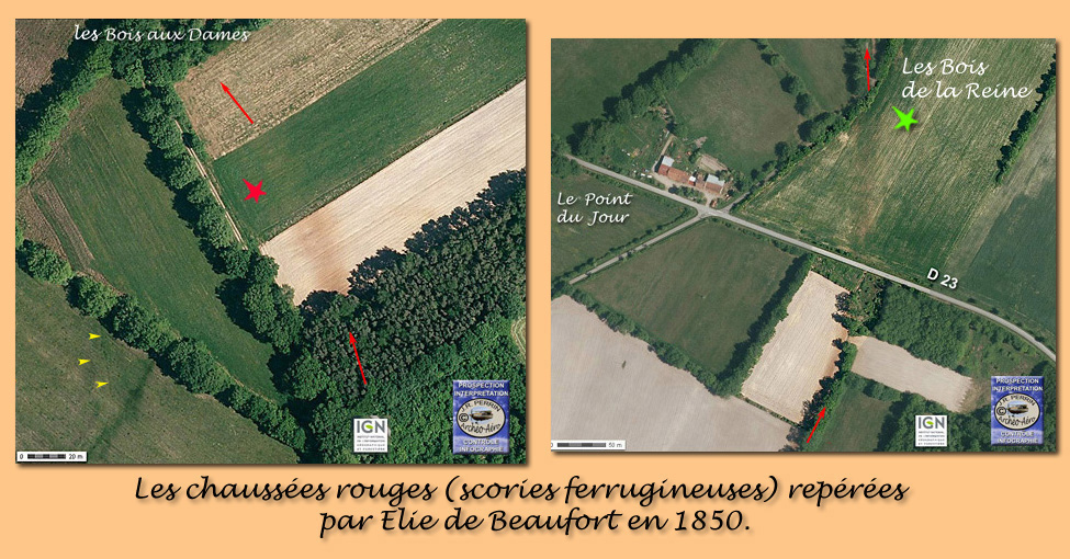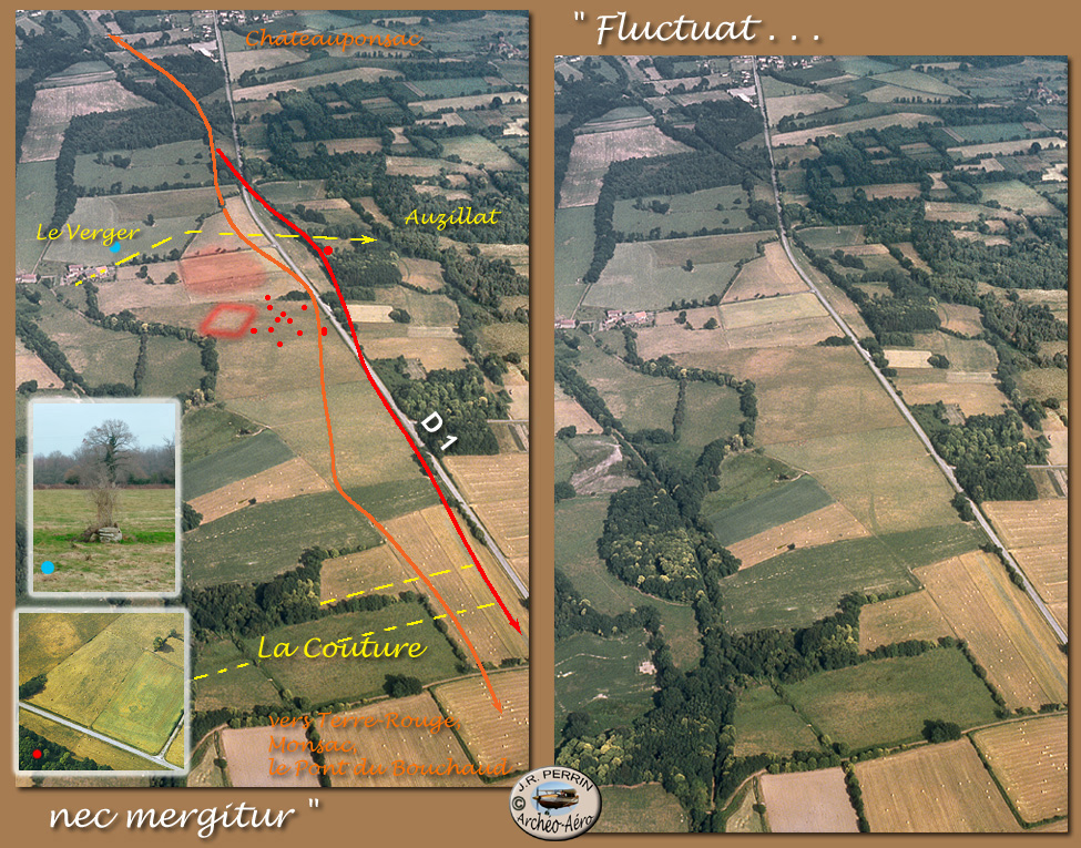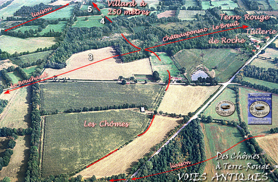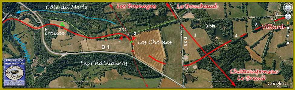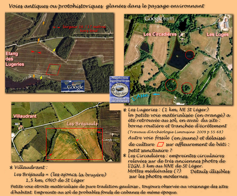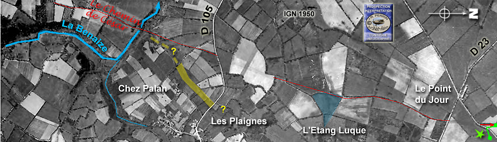 Passé le gué ou le pont, une tranchée routière paraît émerger des bois de rive. Une voie en part et s'individualise par un arbre relique au milieu d'une parcelle. Passé le chemin de desserte de Chez-Palant, une haie prend le relais.Puis des traces apparaissent dans un labour . Plus loin, vers le nord, les restes de la chaussée antique ont servi à asseoir la levée de terre d'un étang moderne : l'étang Luque. La voie s'inscrit alors en continuité apparente, sur les photos aériennes de l'IGN et de Google. A quelques minuscules écarts près, ce sont ces restes rouges de chaussées antiques qui conduisirent Elie de Beaufort en 1850, jusqu'à Chaillac, à 10 kilomètres de là . Les photos modernes heureusement complétées par d'autres plus anciennes (1950), nous restituent ce parcours par des longs rubans de scories, déchets sans doute issus d'une activité sidérurgique artisanale dans laquelle nos ancêtres gaulois excellaient.