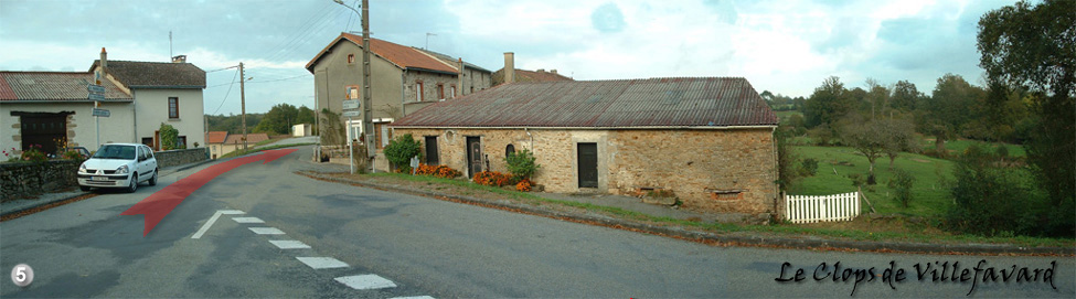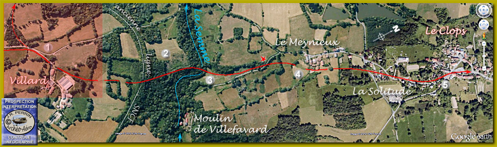 en prospectant la rivière Semme en aval du Moulin de Villefavard. Sur l'autre rive, il ne fut pas utile de descendre jusque-à la rivière : à mi-pente la belle tranchée routière montante de la Côte-Loube ne laissait déjà plus aucun doute sur la suite du parcours antique (panoramiques n° 3 ci-dessus). A noter en particulier en remontant vers le Meynieux, la double inflexion de la petite route du Moulin (parcours en baïonnette) pour négocier, lors de sa création à une date aussi vague que reculée , la traversée de la haute chaussée résiduelle de la voie romaine (étoile rouge ci-dessous). |