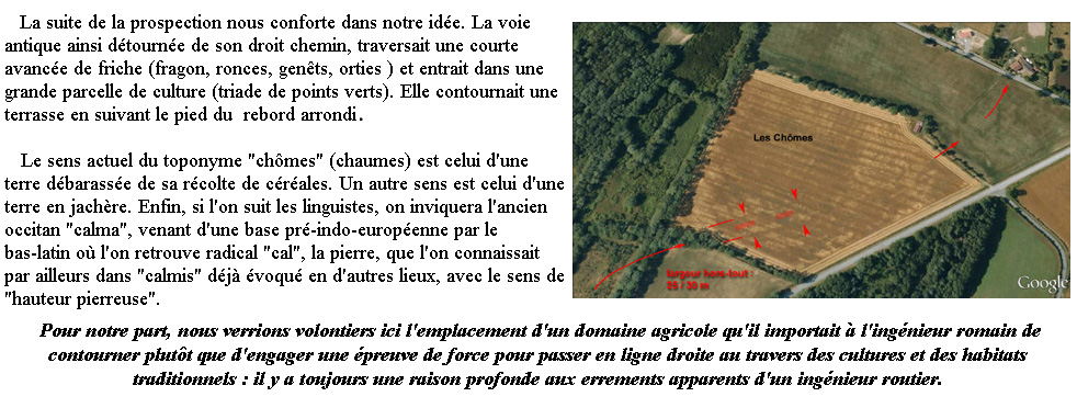 A d'autres moments comme ici (photo 5) et parfois sur la même voie, l'emprise est considérablement plus étroite. Nous pensons que le pillage des voies, dans les temps qui ont marqué la décadence de l'Empire et les siècles qui ont suivi, ne s'est pas effectué de façon uniforme. Dans le cas présent, la chaussée aurait pu être simplement écaillée pour permettre une précaire récupération agricole du sol. Par contre l'enlèvement des grosses margines, pierres posées de chant sur les rives de la chaussée, recherchées tant pour la construction que par souci de débarrasser le sol d'éléments encombrants, aurait laissé d'importantes fondrières. Les fouilles alors se seraient remplies naturellement d'éléments meubles tantôt favorisant la bonne venue d'arbres de rapport ou subsistant en tant que longues lignes de dépression toujours perceptibles malgré des siècles de façons culturales (voir également le cliché 3 et le cliché Google ci-dessus) . |
