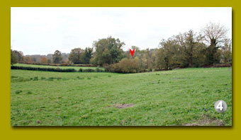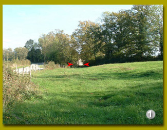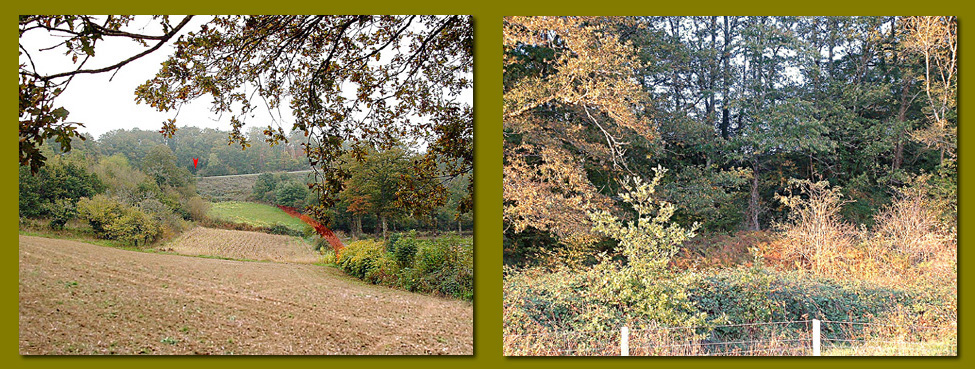 | Remarqué également en parcourant un vieux chemin transverse entre le Meynieux et la Solitude (photo 4), la dépression en jonchère laissée par la voie au milieu d'une prairie : observez au fond du champ, les touffes de noisetiers (pointe de flèche rouge) qui colonisent localement les haies au droit du passage des voies antiques (les sols frais). Plus claires, des cépées de saules se remarqueront ailleurs lorsque l'imprégnation hydrique sera plus constante et abondante. |